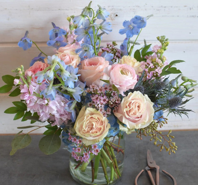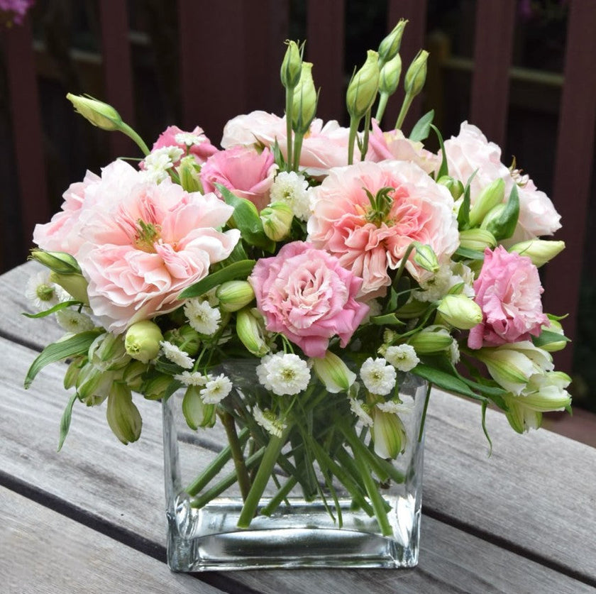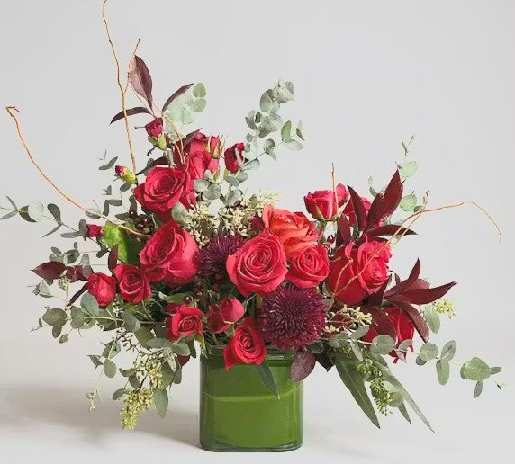 The Birth Month Floral Collection is a show-stopping lineup of arrangements by birth month. Designed with the season's best of roses, spray roses, lisianthus, ranunculus, or garden roses in sunny, cheerful hues to match your recipient's birth month. Depending on the size—and the season—you might also see striking pin cushion, elegant lilies, or bold dahlias making an appearance. Adding playful texture and charm are rich coffee bean, fragrant stock, button daisies, sprays of golden solidago, lively snapdragons, and those round, cheerful billy balls. All of this is paired with lush greenery to create a fresh, layered look. Using our birthstone chart, select your birthday month and let our designers get to work on your custom Birth Month Floral arrangement!