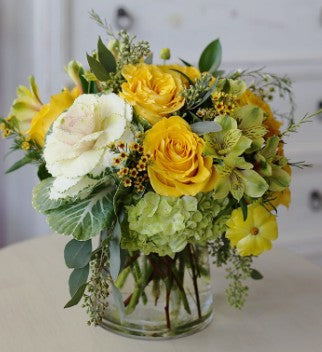 A classic color palette of green and yellow will always brighten up someone's special day. Bring this classic home to a loved one or a friend on their Birthday. The Golden Belle is a wonderful way to say Happy Birthday to anyone celebrating another trip around the sun. With golden yellow roses, green mini hydragea and other array of yellows and greens this beauty will brighten anyone's day.